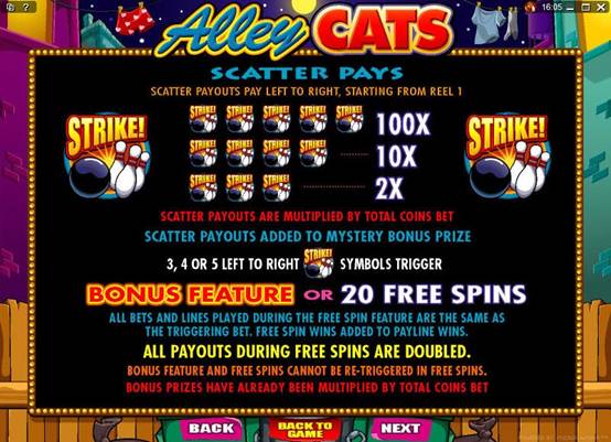 BOWLING FOR BOUNTY WITH THE COOL CATS Some of the coolest cats in town set the tone for ALLEY CATS, a new 5 reel, 9 payline video slot now ready for play at Riverbelle Online Casino.The action is a backyard bowling alley used by a wide variety of frisky felines with their eyes set on trashcan victory feasts, but for the player there's a lot more temptation than catnip and fish heads; this is a magnificent slot where up to 50 000.00 can be won in the base game, double that in Free Spins and another 2700.00 on an amusing second screen bonus feature. With vibrant, colorful graphics and crystal clear digital sound effects, Alley Cats provides hours of entertainment and good chances to win. The key to unlocking the winning opportunities in the game is the Strike! symbol which acts as a scatter and can additionally trigger a choice of Free Spins or bonus feature for the player. The Strike! logo can deliver up to 100x winnings and trigger 20 Free Spins in which all wins are doubled or a second screen bonus that takes the player to the cats' favorite alley and 3 chances to bowl for prizes on six home-made 'skittles,' one of them an unfortunate captive Chihuahua! Alley Cats has a fresh and amusing theme carrying a game with loads of entertainment potential and rewards.