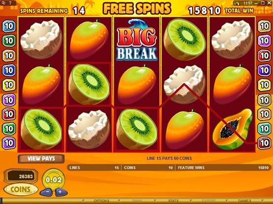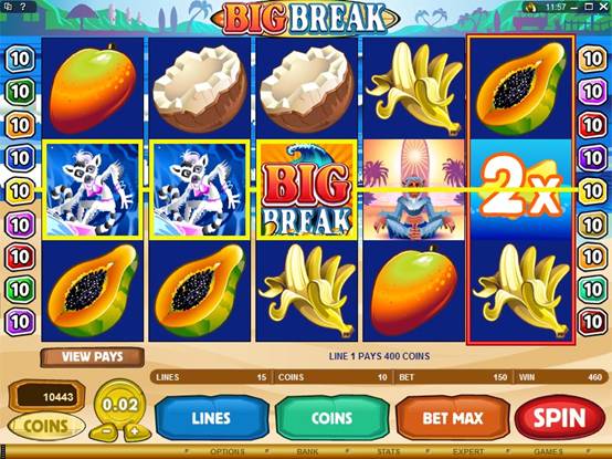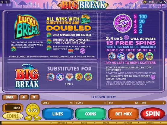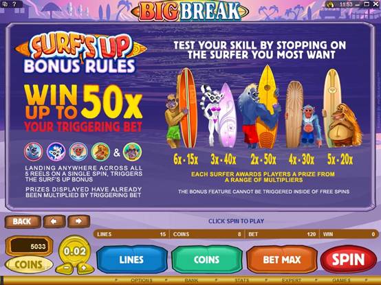 Introduction Are you ready for your Big Break? This 15 line slot will make you feel waves of excitement and its happy-go-lucky surfing theme will make you want to head to the beach, along with its 5 main monkeys of course!This slot has a sea of features. Be ever watchful for the “Lucky Break” on the 5th reel, as this could stand you a chance to win, not only a left to right win, BUT also, a right to left win! The next feature to roll in is 15 Free Spins where all high symbols act as scatters multiplying your win by total bet. And last, but not least is the Surf’s Up skill-stop bonus. You’ll go bananas for this slot!